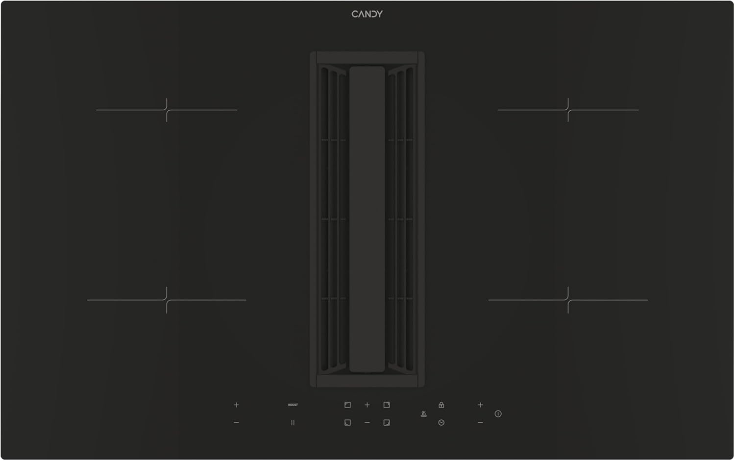 Candy CIH8I4CF Placa de Inducción con Campana Integrada, 4 Zonas, 80CM, 9 Niveles de Potencia, 7KW, Mandos Independientes, Temporizador, Bloqueo Seguridad, Alerta Sobrecalentamiento y Derrames, Negro
